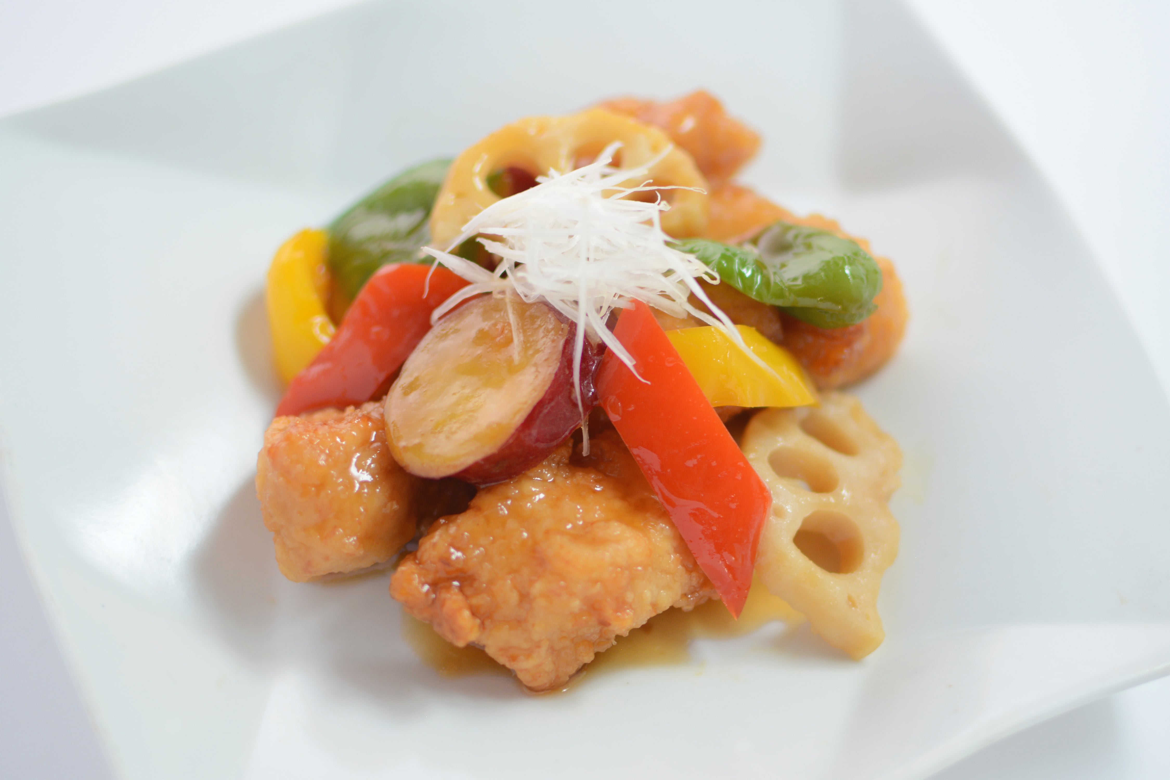 原材料名 湯葉入り鶏唐揚げ(国内製造)、黒酢あんのたれ、さつま芋、蓮根、パプリカ、ピーマン、食用植物油脂/加工澱粉、pH調整剤、調味料(アミノ酸等)、酸味料、増粘剤(加工澱粉)、(一部に小麦・大豆・さば・鶏肉を含む)