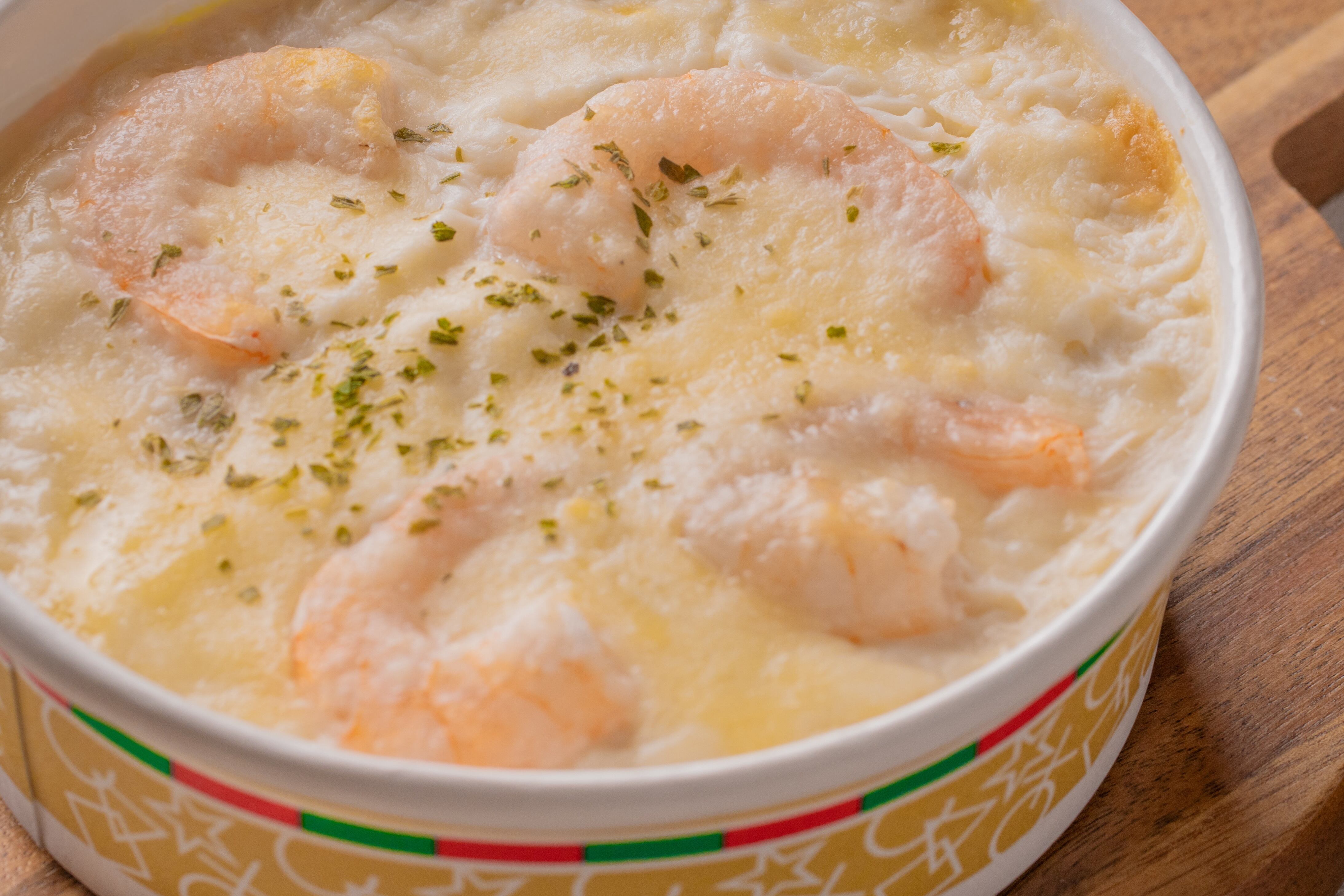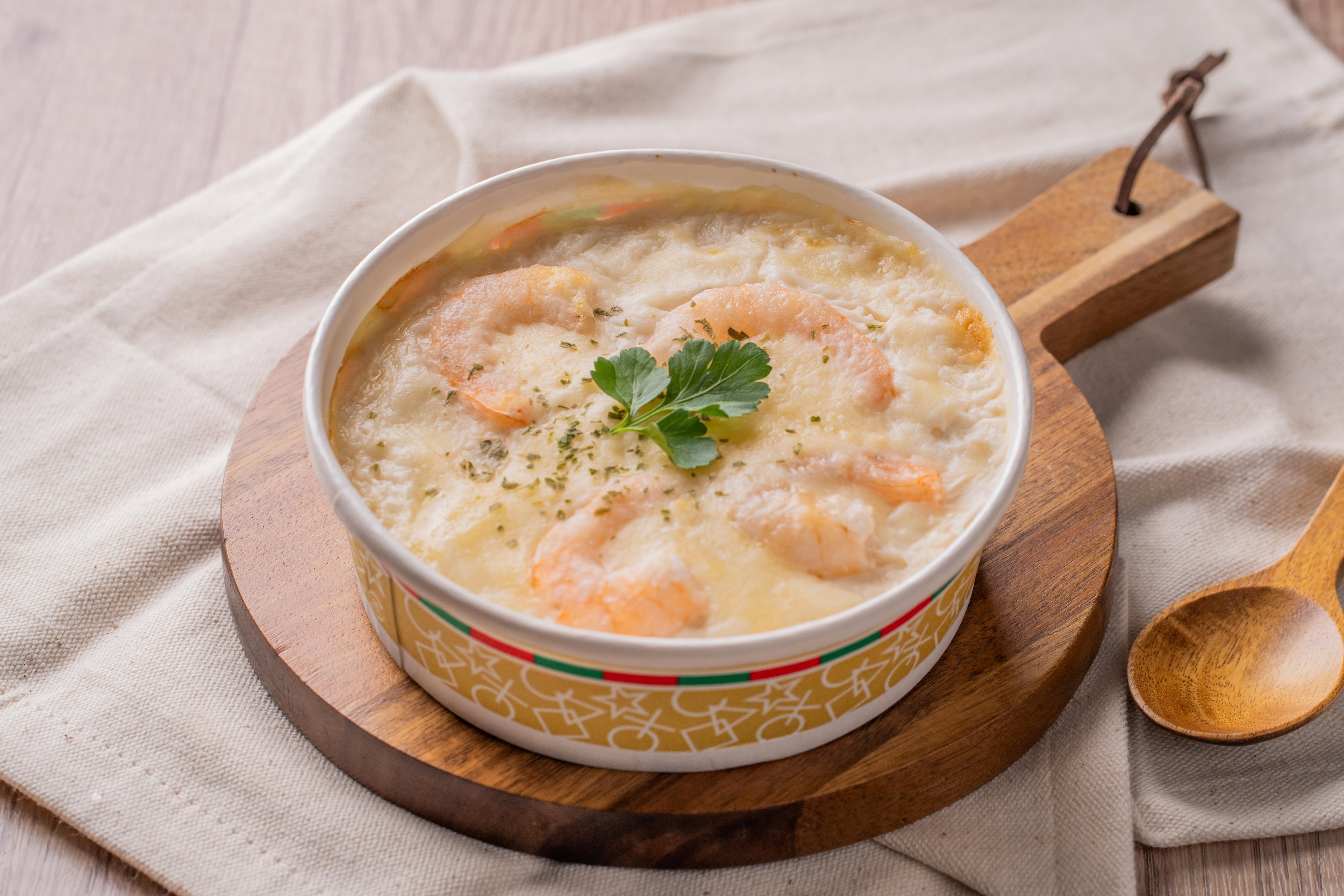 原材料名 玄米(国産)、チーズ、玉ねぎ、小麦粉、牛乳、バナメイエビ、チキンコンソメ、バター、マーガリン、塩